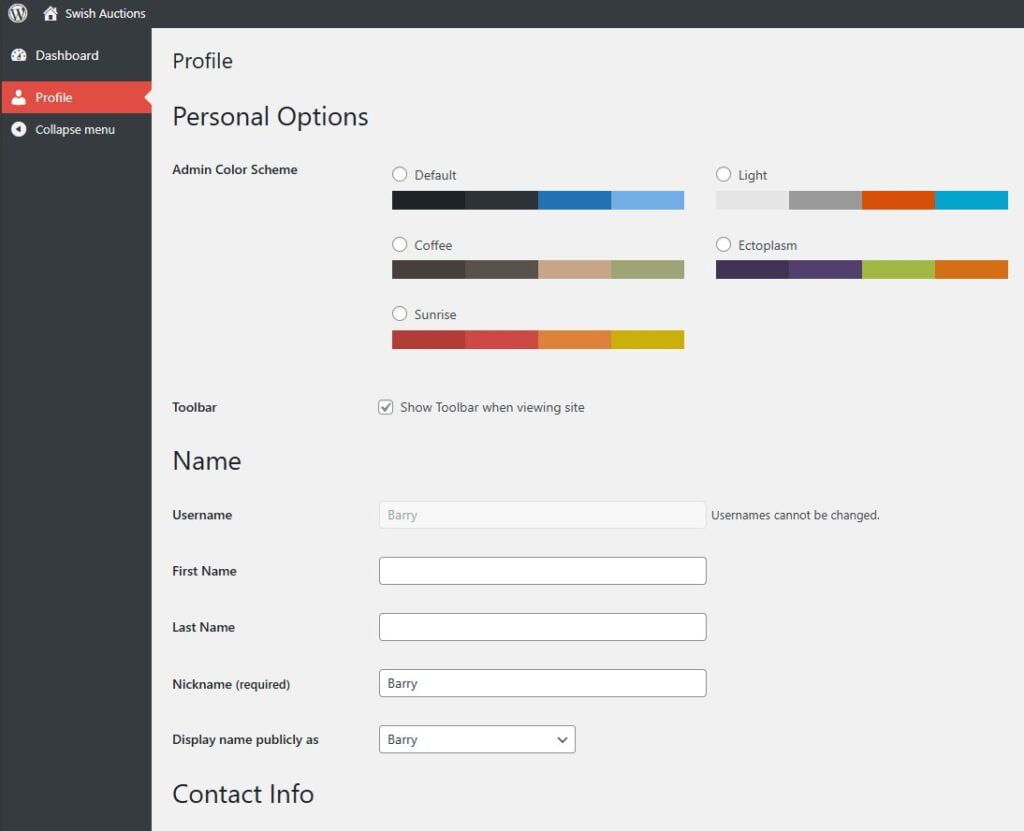 - Login: after logging in, you will see this landing page. (See Image Below) This is your personal profile page. Please add your details so we know who you are if you have a winning bid. Be sure to click “Save” at the bottom to keep the changes. Only your Nickname will be visible to the public.